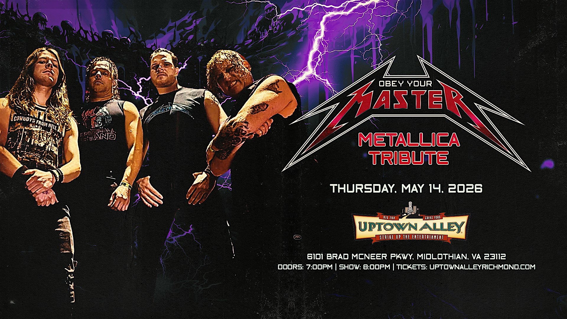 An epic night with Obey Your Master: The Ultimate Metallica Experience at Uptown Alley on Thursday, May 14th!Uptown Alley & LXGRP Presents:Obey Your Master: The Ultimate Metallica ExperienceBased out of the tri-state area (NY, NJ, PA), Obey Your Master is glued together by four Metallica juggernauts with one thing in mind; to bring the audience