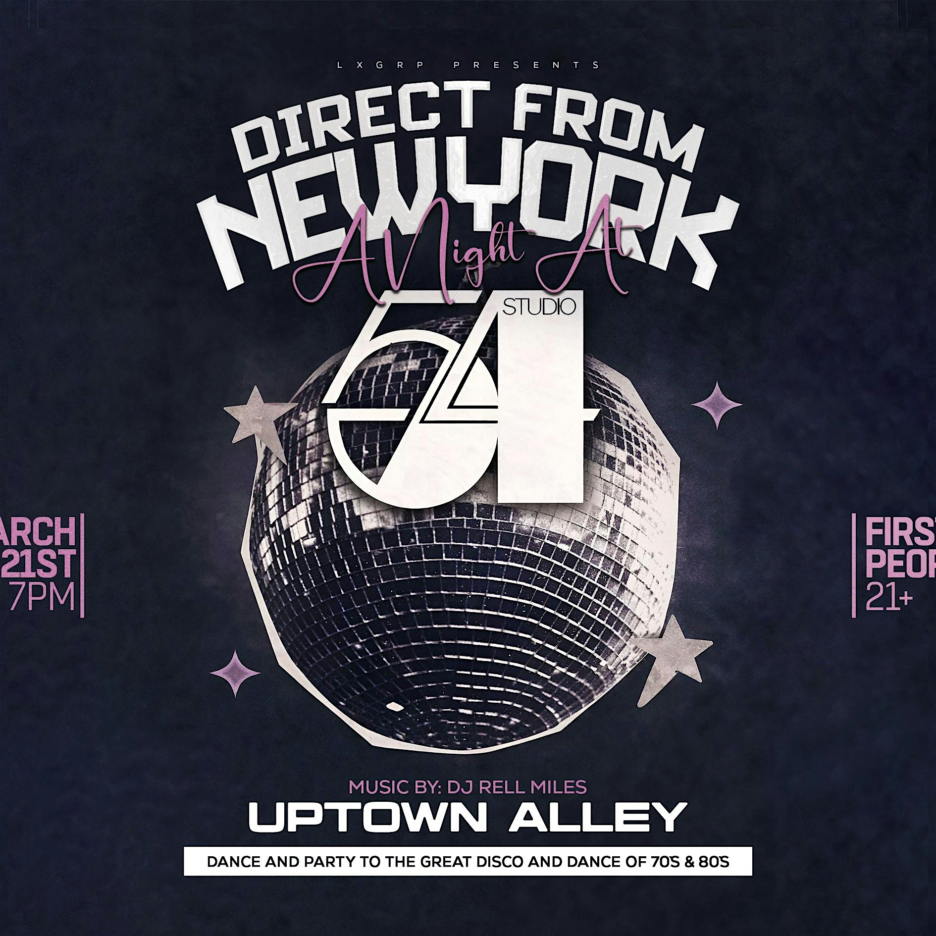 A night of glam and disco with Direct From New York: A Night at Studio 54 at Uptown Alley on Saturday, March 21st!Uptown Alley & LXGRP Presents:Direct From New York: A Night at Studio 54Step into the glitter, the glam, and the groove of the ultimate disco era.Direct From New York: A Night at Studio